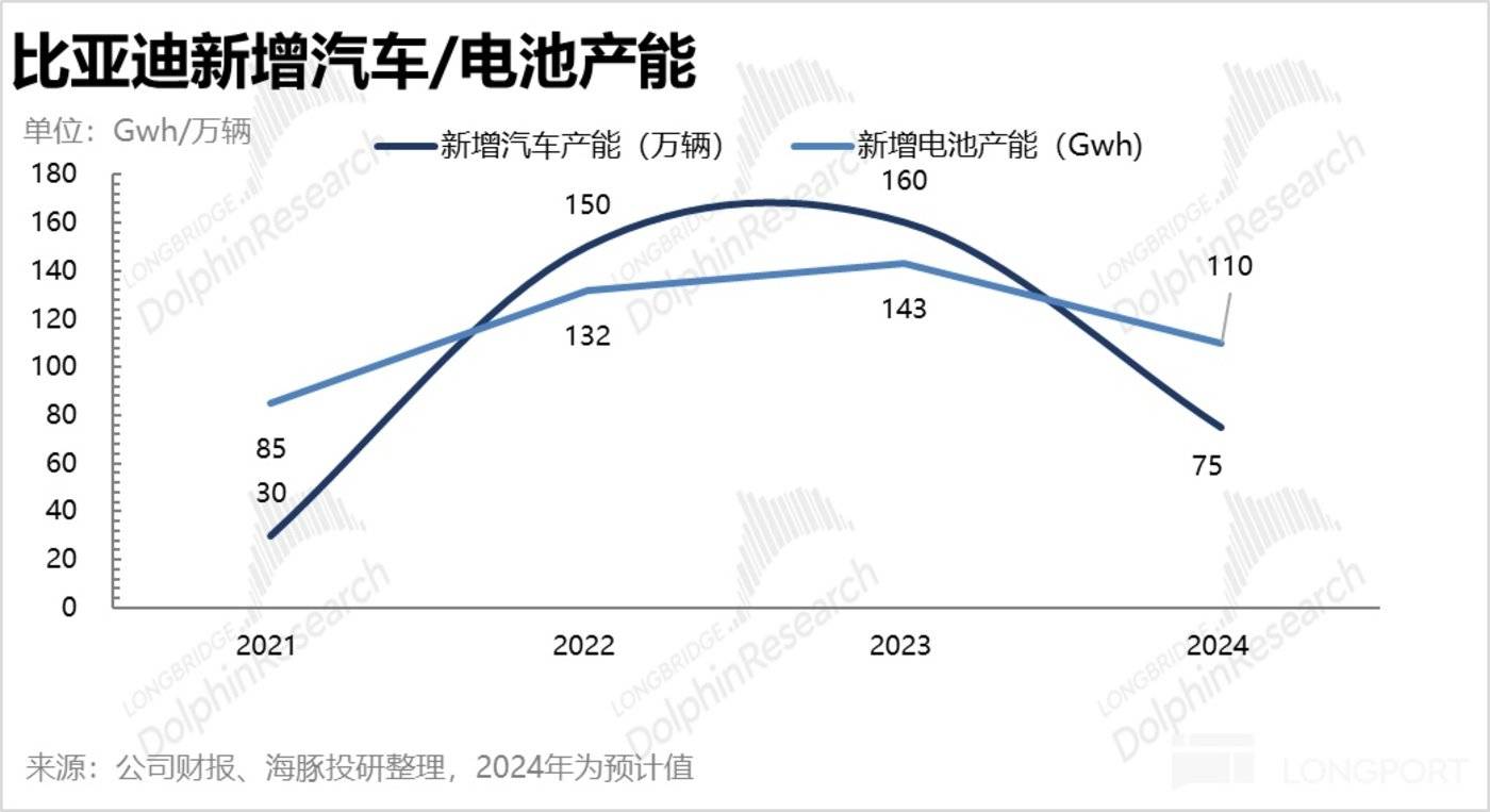 而 2024 年上半年无论是从固定资产购入额减少,还是新增在建工程和在建工程转固都呈现明显下滑趋势,以及从电池和汽车产能来看,目前和未来的在建产能都足够充裕 (海豚君预计 2024 年新能源汽车/电池在建产能也明显下滑),似乎都意味着,比亚迪在垂直一体化上前置性投入本轮已经到达了阶段性尾声。