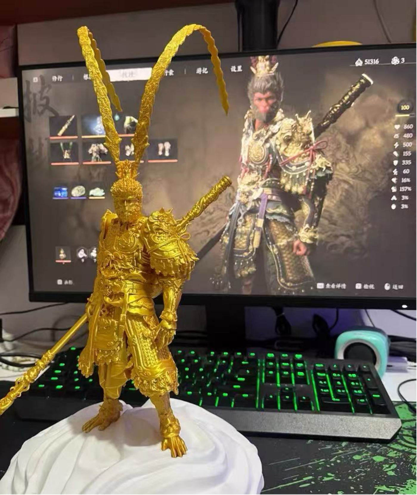 「我现在基本上都是在做成品,包括打印、组装、打磨、喷漆/手绘上色。代打就是图个方便。」 代琰成交的第一单是 《黑神话:悟空》 的 「天命人」 套装,售价 108 元,耗时 2 天多。「那会儿刚开始不是很懂,还有模型打坏的情况。这个 108 元的价格其实算是低的,因为这个模型拆支撑很难,要拆很久,而且用的是丝绸料。」 他告诉惊蛰研究所,这个套装最初的定价其实是 158 元,但没人买,于是就降到了 108 元,也是抱着先成交的心态。