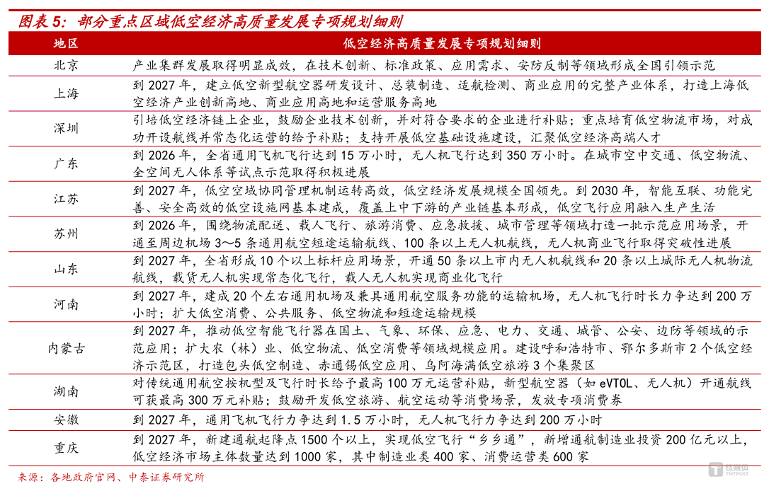 政策红利直接催化了产业投资热潮,各地“ 真金白银” 的扶持措施层出不穷。重庆市将低空公共服务纳入政府购买服务目录,对空天信息地面站网配套建设项目给予最高 1000 万元的支持。广东省对新获批的低空领域省级重点实验室予以重金资助;云南省每年发放 2000 万元消费券,直接刺激高空跳伞、低空观光等消费活动。四川省则支持企业攻关混合动力发动机、高能量密度航空电池等关键环节,按项目投入的 30% 给予最高 2000 万元的财政支持。