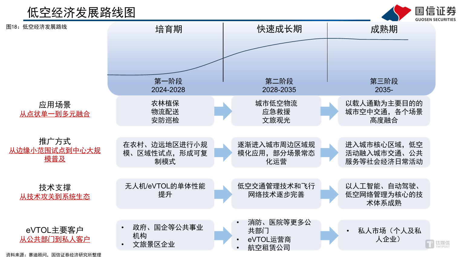 对于整个低空经济的产业发展状况,国信证券指出,低空经济产业发展历程有望类比新能源汽车产业,但成长期整体节奏更快。当前 eVTOL 所处阶段或类似于新能源汽车 2010-2012 年,这一阶段国家战略层面提出汽车业电动化技术转型战略,明确新能源汽车为战略新兴产业,处第一轮推广应用 实施阶段。eVTOL 有望通过复用新能源汽车的关键零部件加速降本过程,凭借成本优势引领我国 eVTOL 产业在国际赛道上弯道超车。