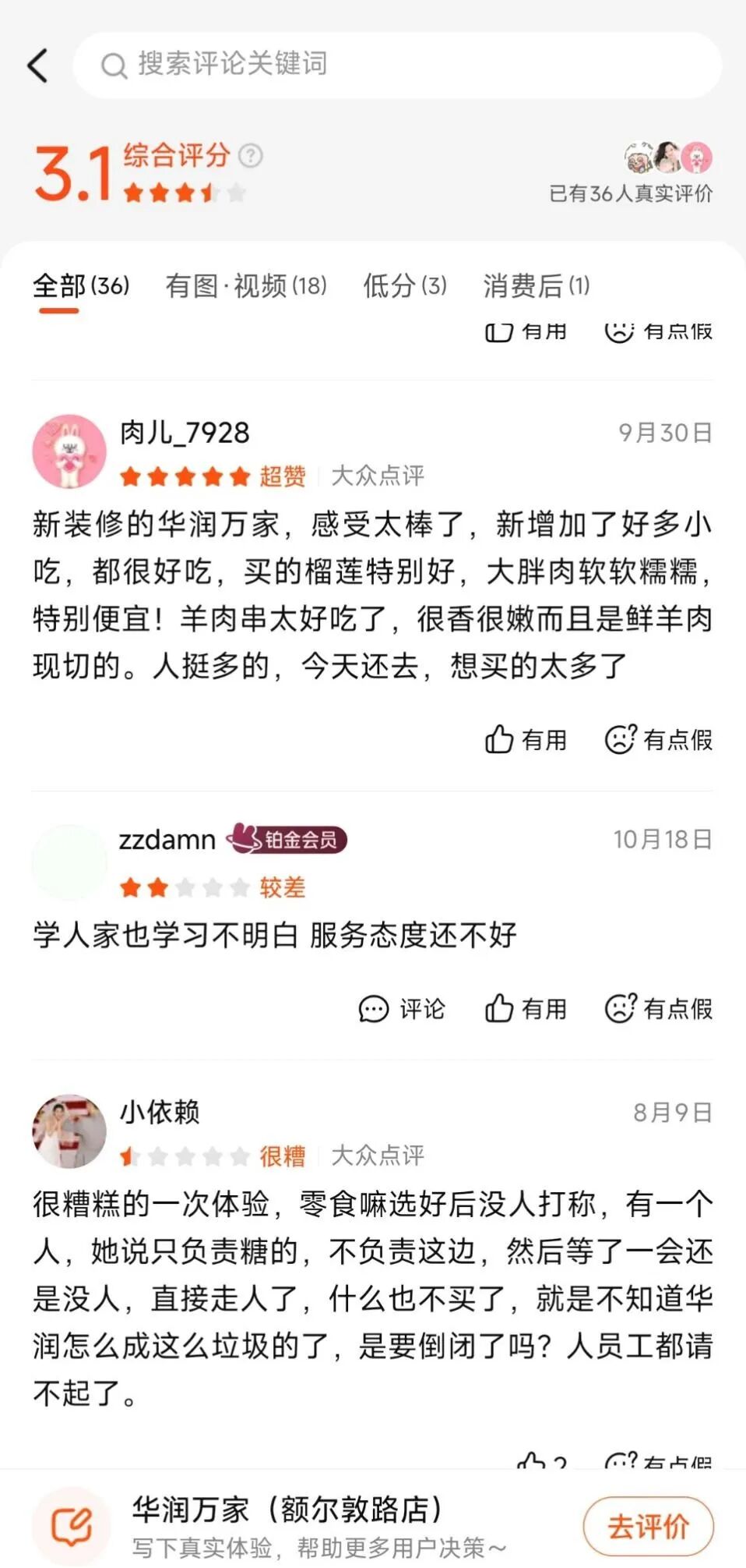 事实上,两个月时间过去,「创业最前线」 将美团定位到内蒙古锡林浩特市华润万家民盛购物中心额尔敦路店,发现有用户在 9 月 30 日还在夸新装修的华润万家体验很好,新增加了好多小吃,都很好吃。但 10 月 18 日,就有匿名用户对这家门店进行“ 差评”,“ 学人家也学习不明白,服务态度还不好。”