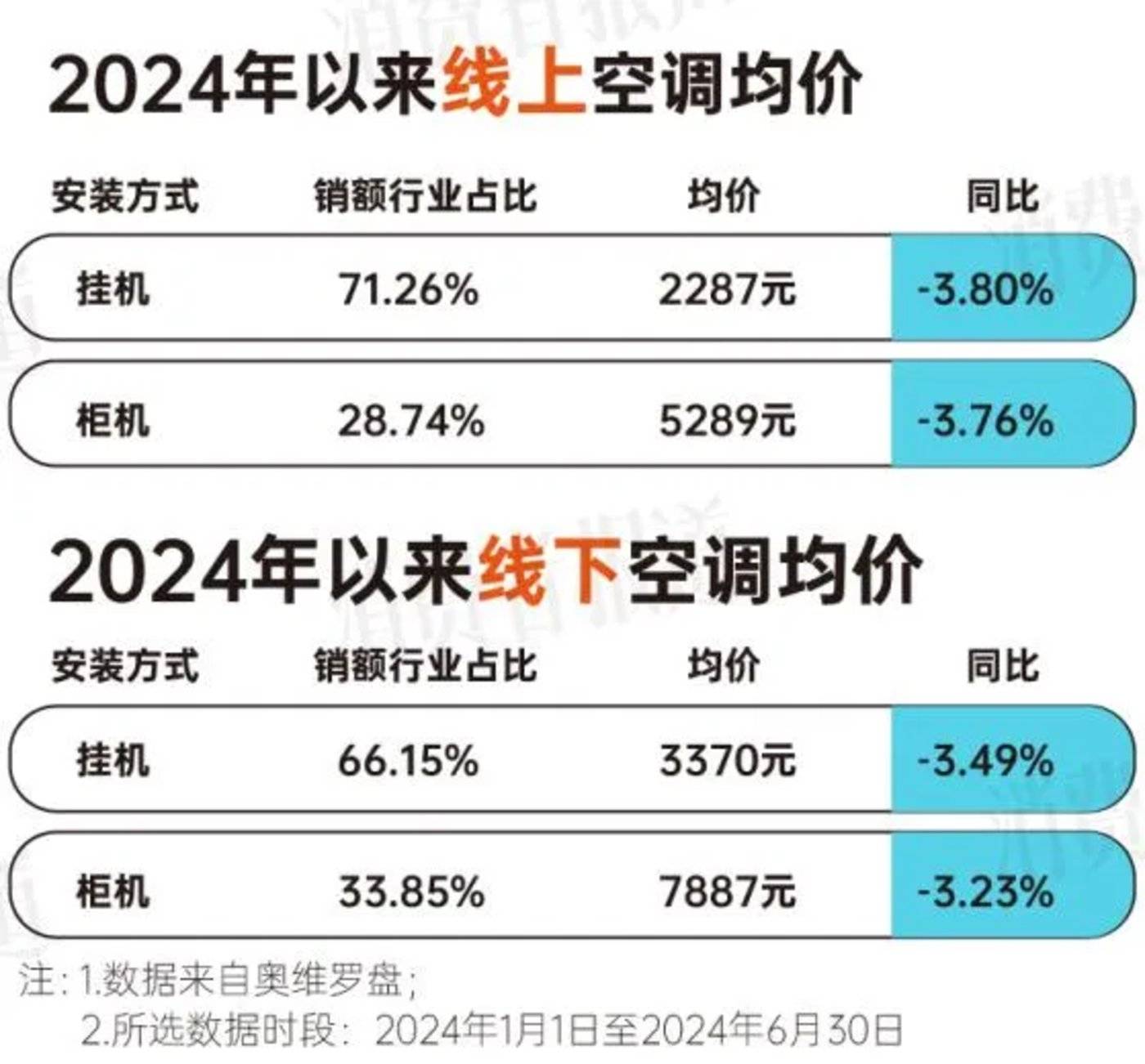 但目前行业竞争大,行业性的价格内卷成为常态。不只是平台的价格战,从企业端来看,以空调为例,今年以来,不管是线上还是线下,空调均价都呈现下降趋势,甚至于核心原材料价格的持续走高,也没有传导到销售终端。