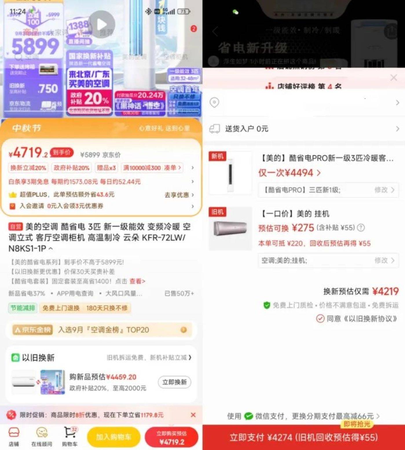 而一台原价 3999 元的大 3 匹的空调柜机,叠加消费补贴+旧机抵扣,最终不到 3000 元就能拿下。