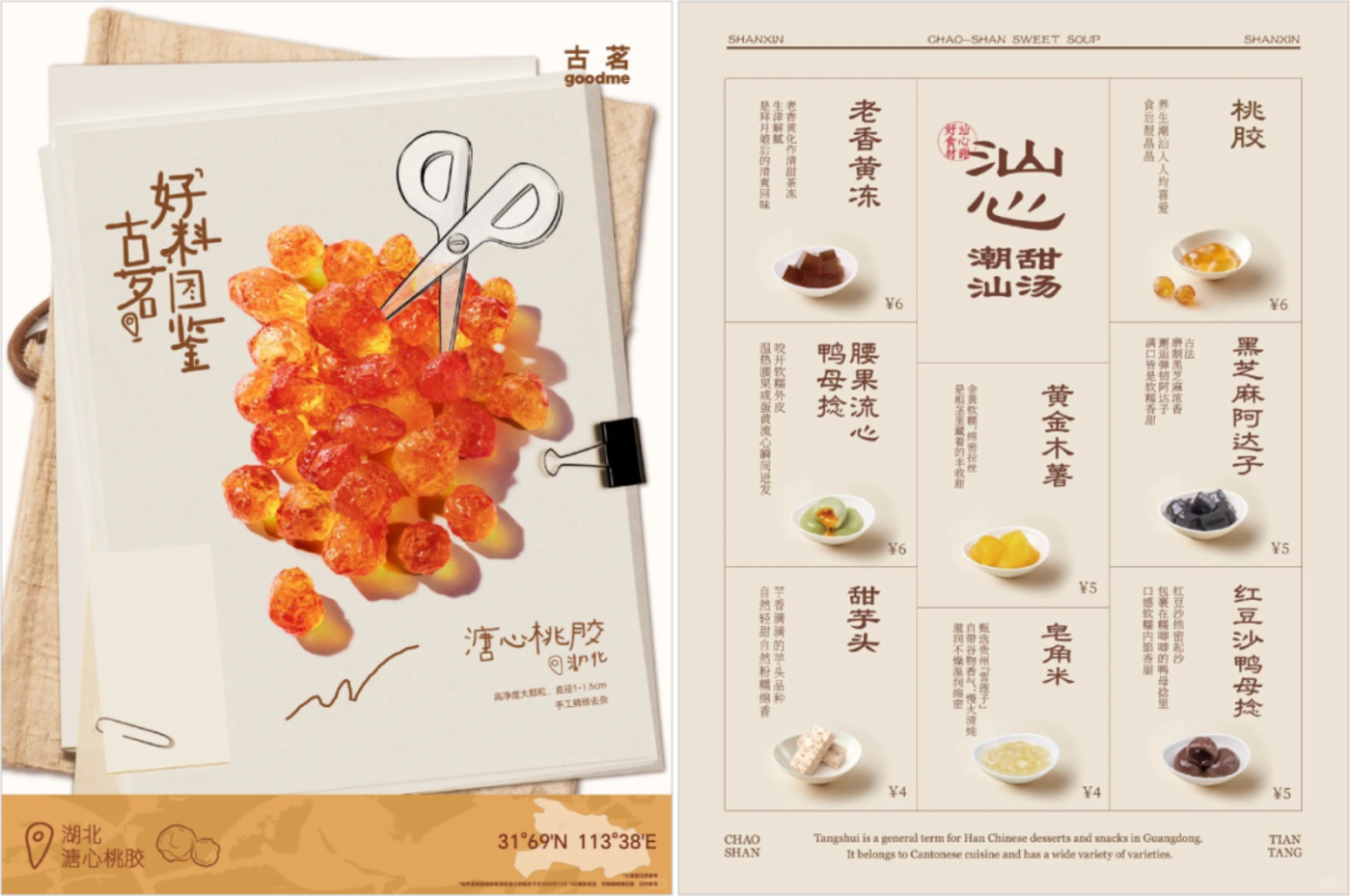 仔细观察这一批糖水新品牌的菜单,不难发现他们的主打单品不再是芒果、芋圆这类被满记、鲜芋仙验证过的传统甜品食材,取而代之的是木薯、桃胶、银耳、海石花等更具地域特色、主打天然养生属性的食材。