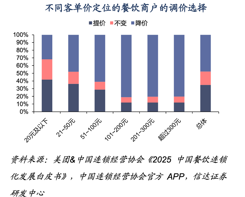 2) 受成本等一系列因素影响,低客单价餐饮商家价格已经基本触底见下图),相比之下高客单价餐饮仍处于降价周期。