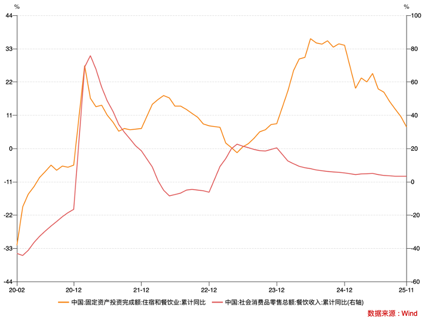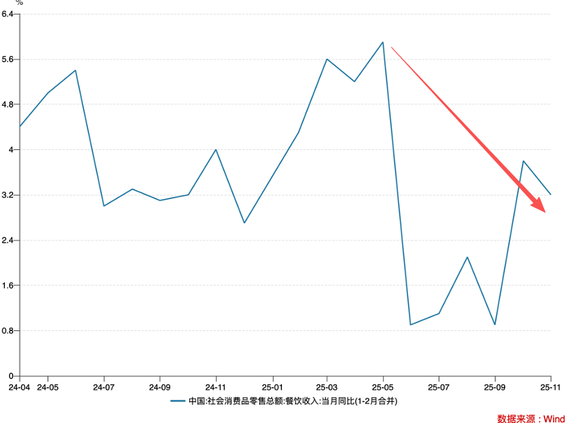 当行业还沉浸在 2023 年“ 淄博烧烤” 的兴奋时,2024 年整个行业景气度乃是急转直下,虽有“ 天水麻辣烫” 偶尔提振士气,但终究抵不过大势,2025 年之后餐饮业同比增速一度跌破 1%,行业信心一度十分灰暗 (大幅跑输 GDP 增速)。