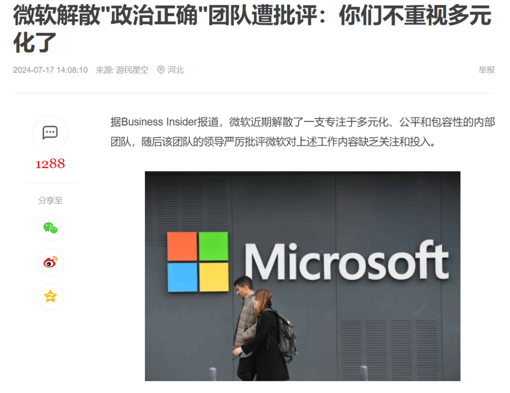 上个月微软解散公司内部专门的多元化团队,还被某些人喷了一波。