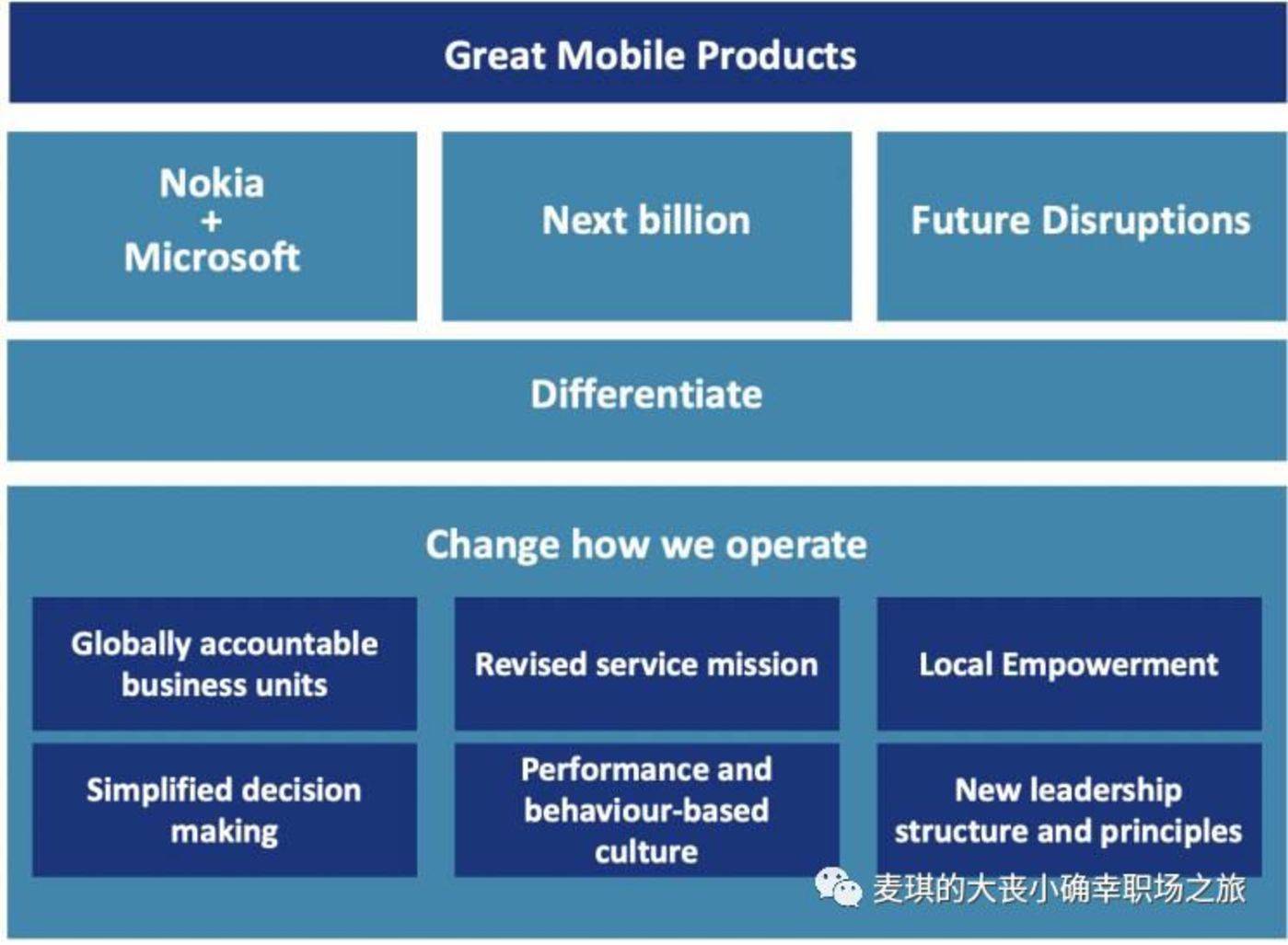 如果当年诺记任命的 CEO 是安西. 范乔基, 他是主张加入安卓阵营的激进派; 如果当年诺记物色了一个"纳德拉"呢,他会翻转诺记的命运去到新的高峰吗? 商业没有彩排,每天都是残酷的实战。写到这里,我突然感慨,诺记是选错了临危受命的总裁啊! 约玛在书中提到,是他主导董事会选择了 ELOP,那么诺记,成也约玛,败也约玛,是历史的宿命吧!2013 年,曾经市值 1500 亿美元,年销售四亿部手机,占据市场份额 45% 以上的诺记,以 72 亿美元插草贱卖微软,成为商业史上一个永恒的话题,也成为数以万计诺记全球员工心中永远的痛!