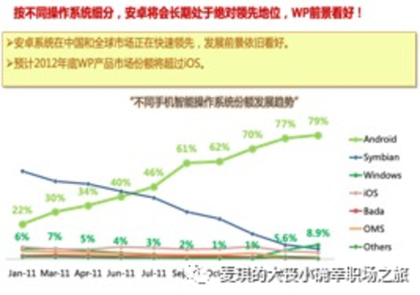 2011 年诺记和大代理商中邮普泰开会,客户的 PPT 预测和专业机构的如出一辙,安卓将一骑绝尘。但是,那份报告中客户硬是写了 WP 会超过 IOS 的鬼话,至于是为了拍诺记马屁还是自己的观点,应该心里有数。