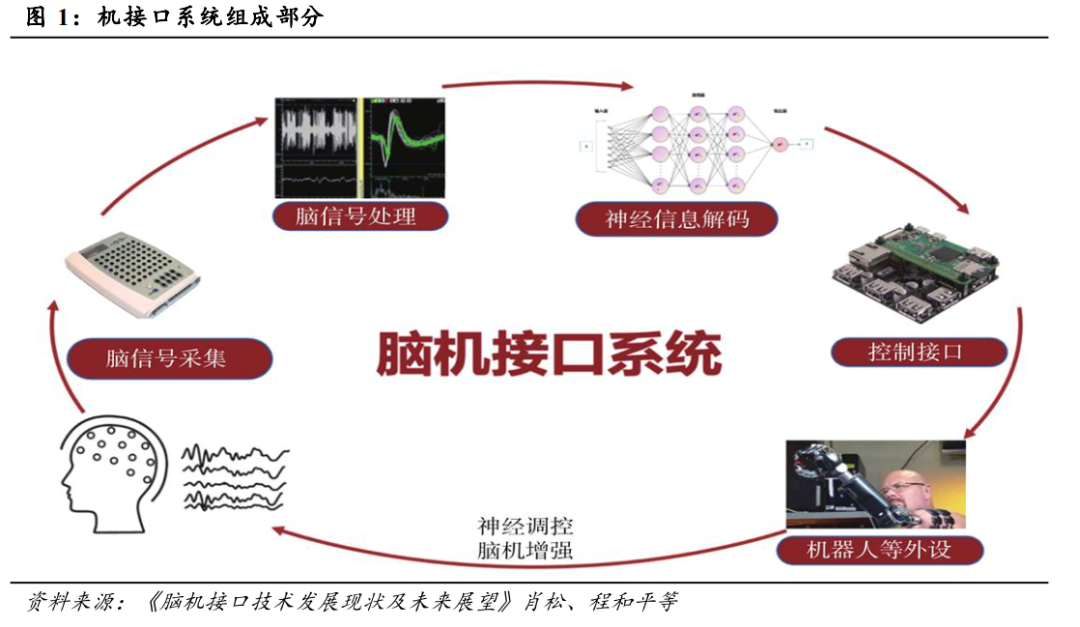 脑机接口系统集成了神经科学、信号处理、计算机科学、人工智能以及电子工程等多种技术,主要由用户 (大脑)、脑信号采集、脑信号处理与解码、控制接口、机器人等外设和神经反馈构成,其中核心组成部分为脑信号采集、脑信号处理与解码、控制接口。