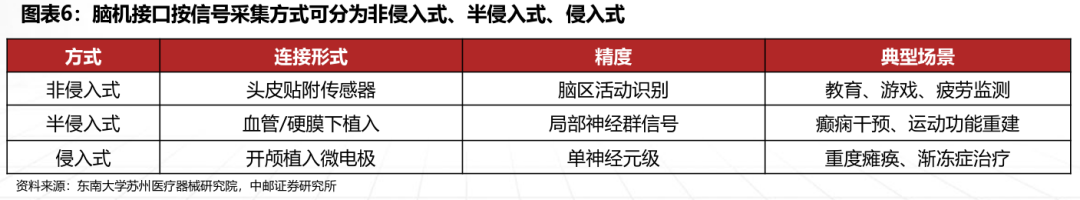 输入式则依靠接收外部刺激并将其转化为大脑内部的感知或认知,以增强或恢复用户的感官体验,通常用于恢复受损的感觉能力;双向交互式则结合了输出式和输入式的功能,进一步提高用户体验和控制精度。根据信号采集方式和技术,可分为侵入式、半侵入式、非侵入式。