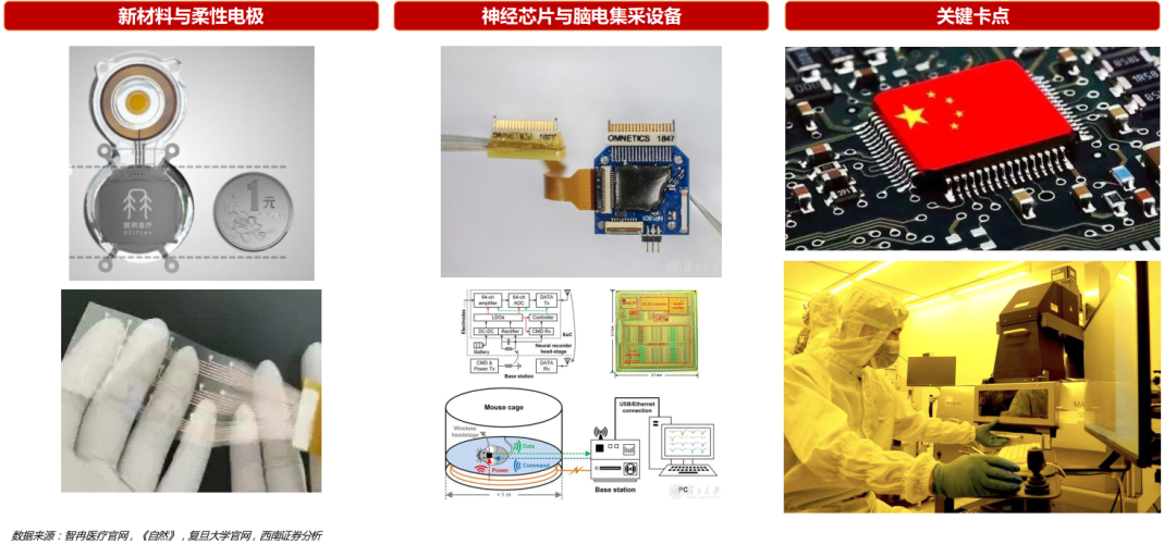 进一步关注中美研发情况,现阶段,中美脑机接口行业之间的差别在于,美国侵入式整体领先,中国在柔性电极等新材料领域有局部优势,并在半侵入式赛道上开辟了具有中国特色的技术路径。具体的竞争则体现在核心元器件和关键技术卡点上,如新材料与柔性电极;神经芯片与脑电集采设备。