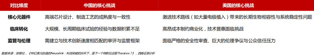 神经芯片与脑电采集设备方面,美国在系统级产品和芯片集成上暂时领先,中国则在特定场景和算法上表现优异;技术卡点方面,中美之间各有侧重,中国目前聚焦高端芯片的自主性与可靠性;美国则在技术激进与安全稳健间平衡。