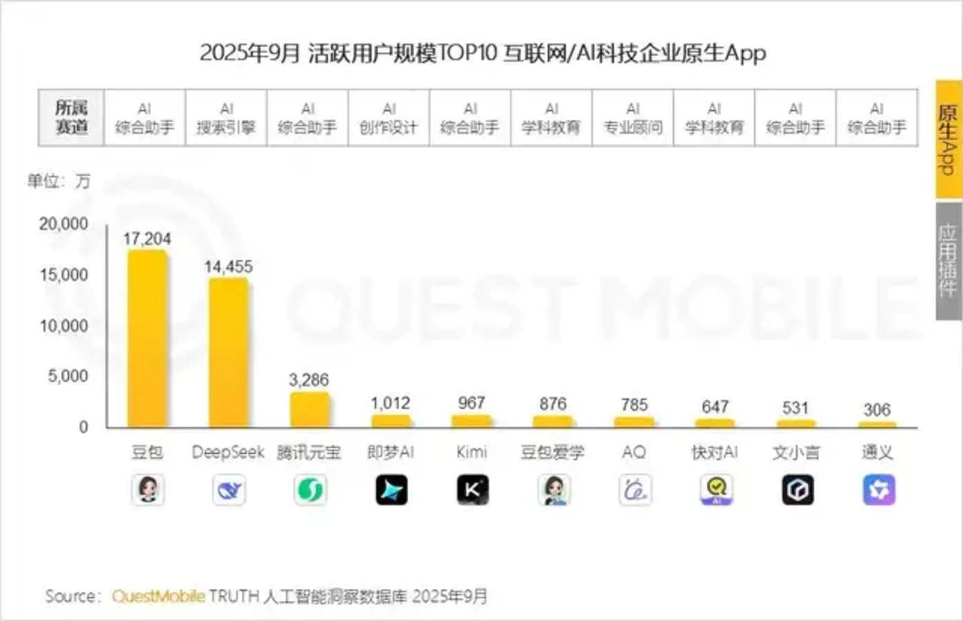 根据 QuestMobile 2025 年第三季度报告,豆包、千问相关应用分别位列 AI 应用月活前列,而 a16z 全球消费级 Gen AI 榜单中,阿里系与字节系产品共同占据五席中的三席,「南北双雄」 的行业格局已然成型。