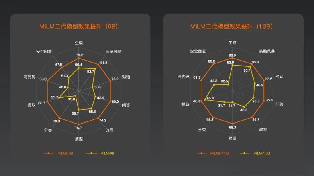 到 2024 年 11 月,小米宣布 MiLM 升级至二代 MiLM2,丰富了模型的参数矩阵,参数规模同时向下和向上扩充,实现了云边端结合,参数尺寸最小为 0.3B,最大为 30B,其中 MiLM2-30B 模型专门为云端设计;同时,新模型在指令跟随、翻译和闲聊等一系列能力上平均提升超 45%……