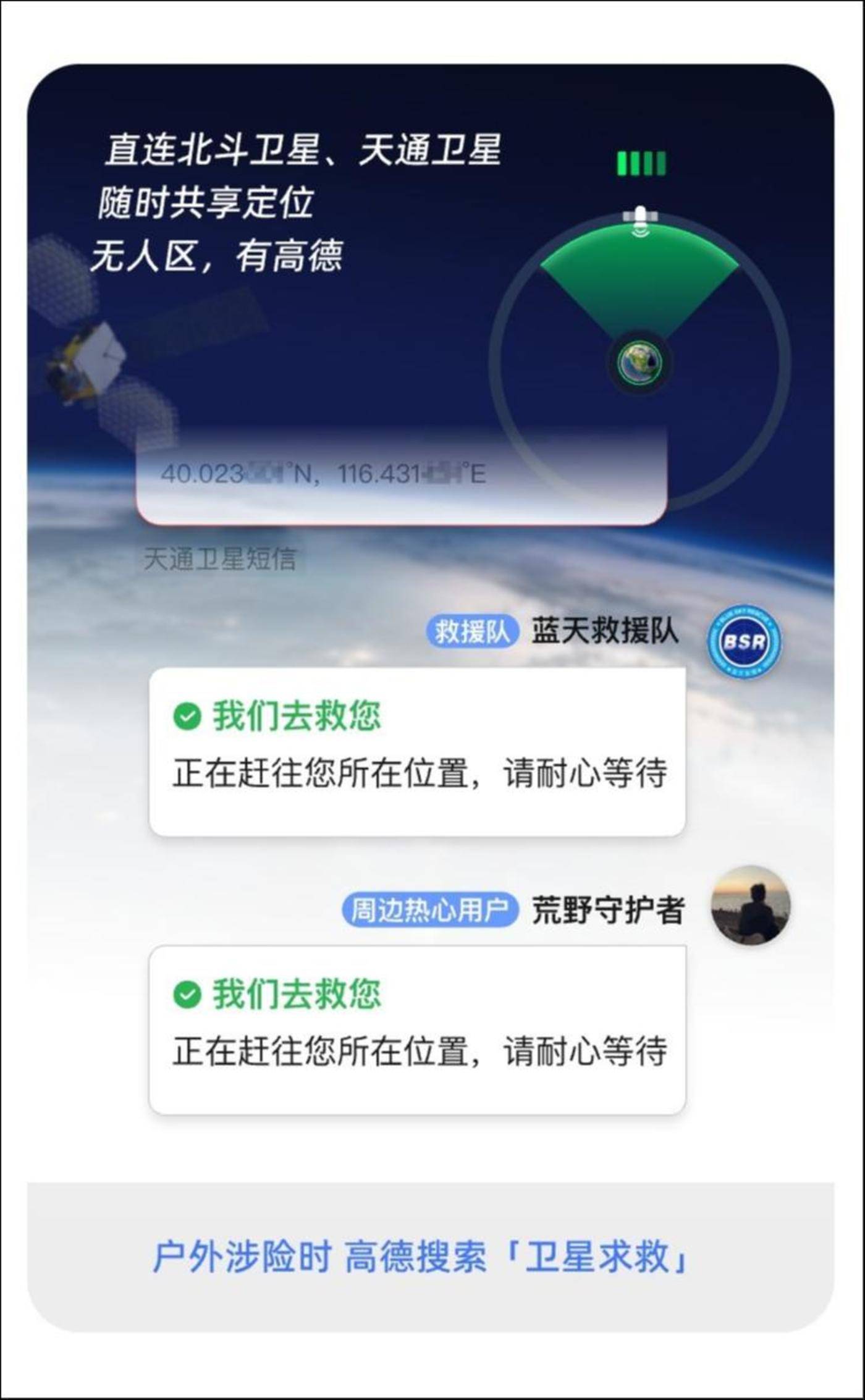 卫星无网导航和卫星救援,核心是与另一大中国核心基建技术北斗卫星联动。这也是高德与北斗一直以来密切合作的延续,主线是用科技的方式解决极限场景的出行体验。