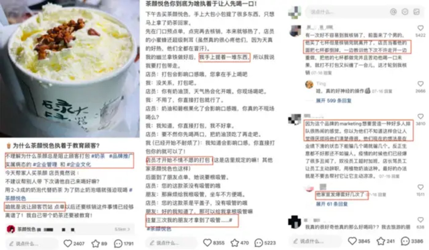 在服务上,茶颜悦色想以绝对标准化来撑起品牌高调性,然而在舆论场却演变成 「物极必反」。