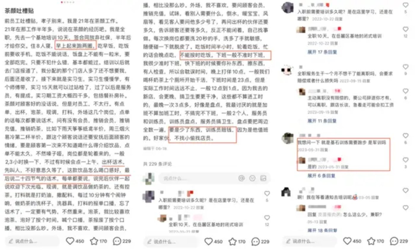 以 「茶颜悦色员工」 为关键词在社交平台上检索发现,多条吐槽茶颜悦色工资少、离职恐拿不到薪水的帖子,直指茶颜打着服务消费者的旗帜来 「压榨」 员工。甚至,茶颜还要求员工入职前军训,2021 年,茶颜还曾上演高管下场和员工 「对骂」 的口水战戏码。