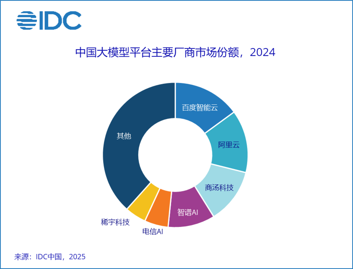 IDC 的报告显示,2024 年中国大模型平台主要厂商市场份额 (统计口径与弗若斯特沙利文报告类似,都是狭义的 「平台」 市场) 的排名是:百度智能云 (第一)、阿里云 (第二)、商汤科技 (第三)、智谱 AI(第四)。