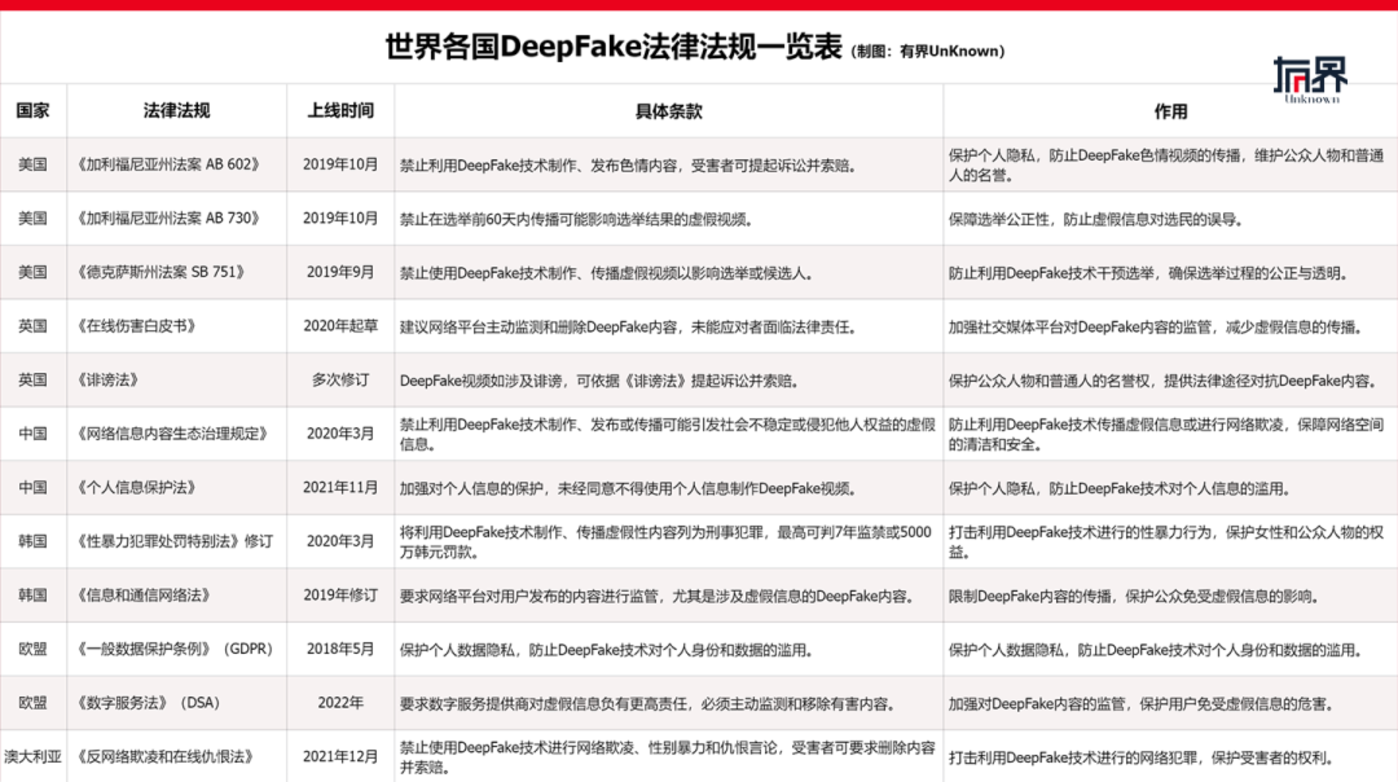 除了韩国之外,美国、英国、欧盟针对 DeepFake 的内容也都有相应的法律,但各个国家的侧重点和保护力度有所不同。