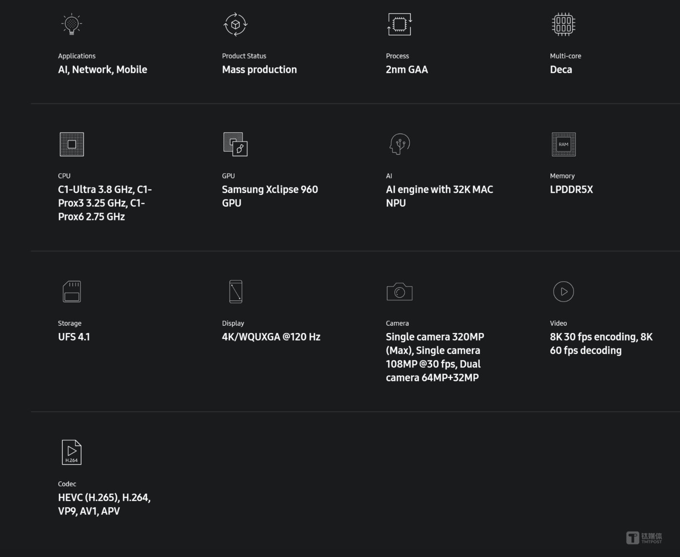 根据公开信息显示,Exynos 2600 基于三星电子 2nm GAA 制程,搭载十核 CPU,基于 Arm v9.3 架构,无传统 「小核」,性能提升 39%;Xclipse 960 GPU 计算性能达到前代的 2 倍,光线追踪性能提升最高达 50%。