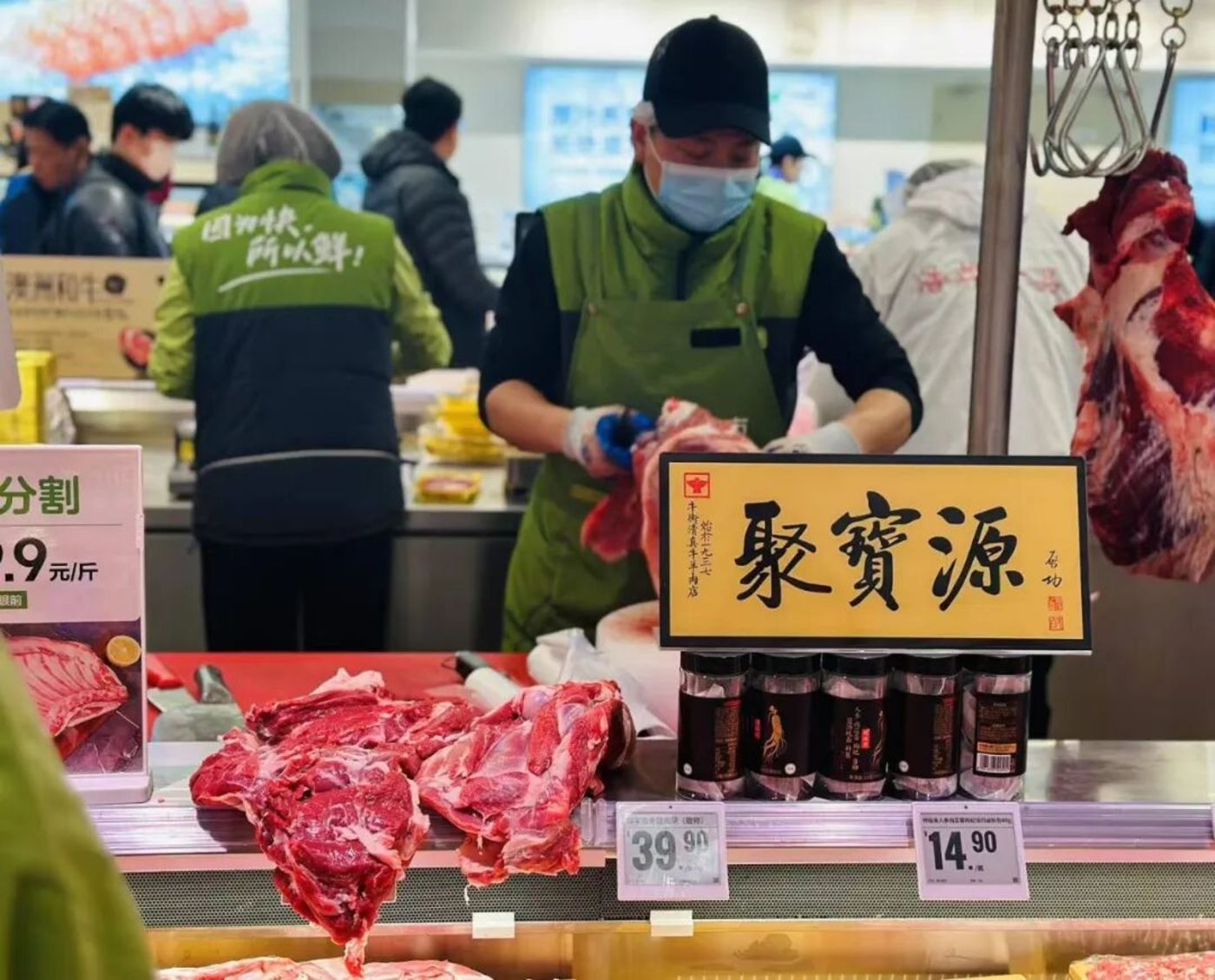 即有美食市集的体验和场景,又构建了水产与肉禽区的免费加工服务 (如鲜肉制肉馅、切片/卷,整禽切块等),甚至设置面食细加工间、熟食加工间——线上难以落地的体验和服务。丰富细致的服务提示和免费水饮、以及销售人员亲切的态度,很有 「胖东来」 式的服务体感。