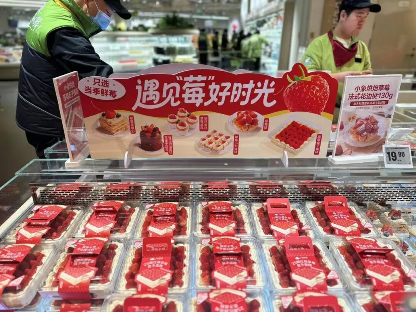 线下店,俨然小象超市自有品牌的 「全品类体验场」,实现差异化和高毛利。一些网红产品价格在开业期间很有竞争力,小象烘焙 750g 草莓盒子蛋糕仅售 49 元,市面同规格其它品牌 79 元。