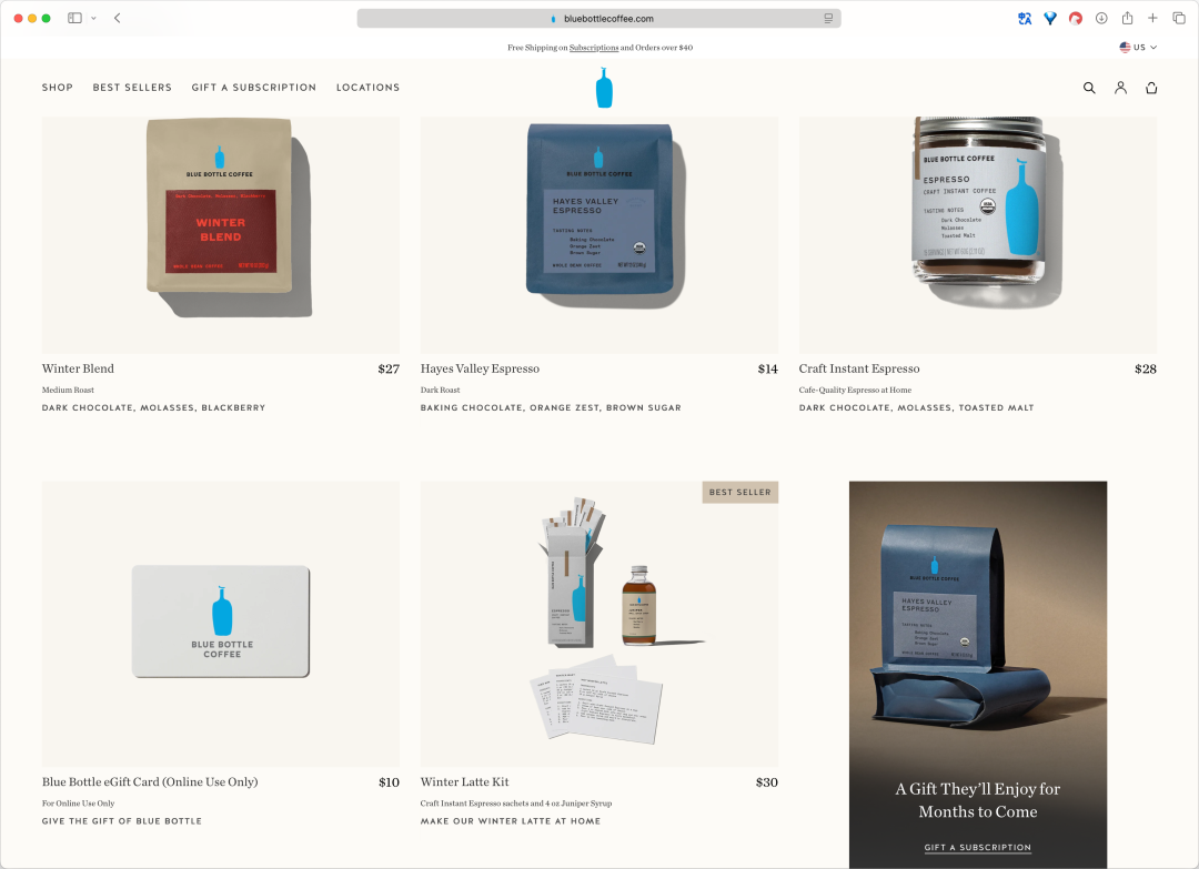 打开蓝瓶咖啡的官网,也洋洋洒洒地列出了包括咖啡豆、即溶咖啡浓缩液、杯子、帆布包等一众衍生产品。