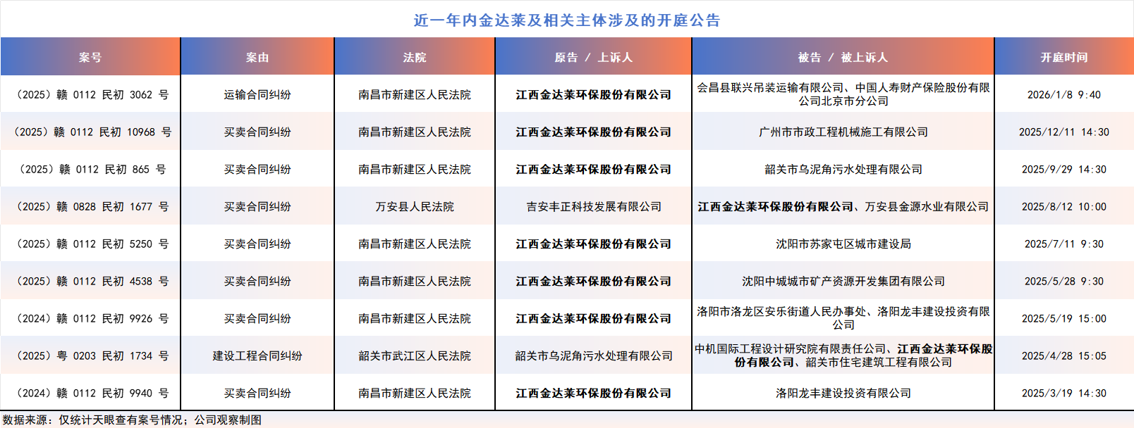 根据天眼查有案号的统计数据,近一年内金达莱及相关主体涉及的开庭公告多达 9 则,案由涵盖 7 则买卖合同纠纷、1 则运输合同纠纷及 1 则建设工程合同纠纷。