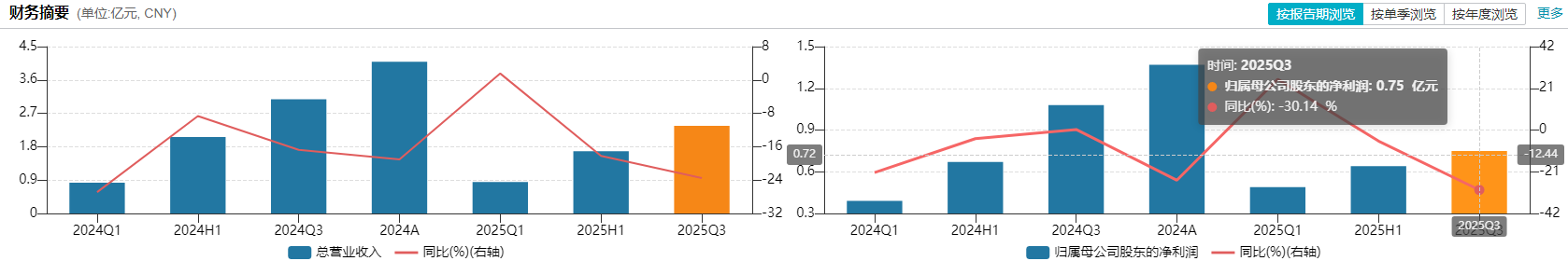 2025 年前三季度,公司实现营收 2.36 亿元,同比下降 23.5%;归母净利润 7547 万元,同比下降 30.14%;扣非净利润 5962 万元,同比下降 38.51%。业绩连续承压之下,寻找第二增长曲线成为必然选择。