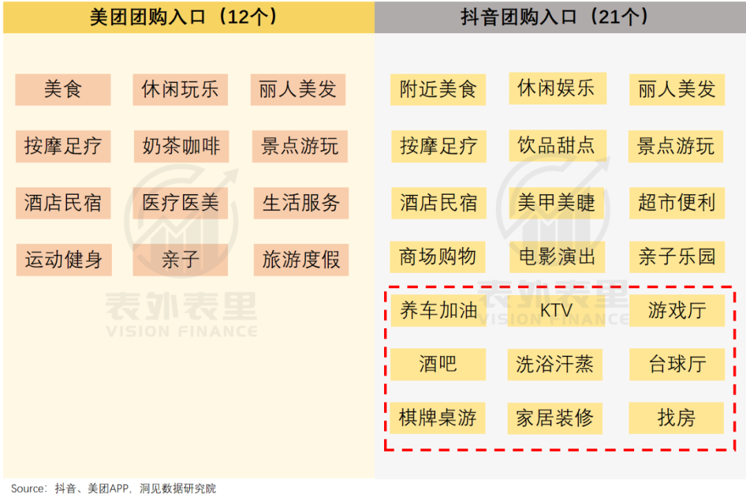 而这样爆发式增长的品类,在抖音至少还有 9 种。如下图,抖音比美团多出的 75% 团购一级入口,几乎都是差异化品类。