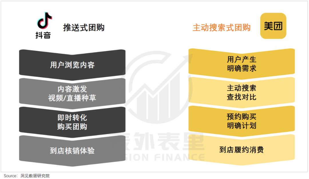 说白了,美团是“ 人找服务”,靠商品陈列与用户评价吸引消费者;而抖音开创了“ 服务找人” 的新模式,借算法将内容投喂给用户,让大家在娱乐时被不经意触发。前者擅长承接需求,后者擅长发掘需求。