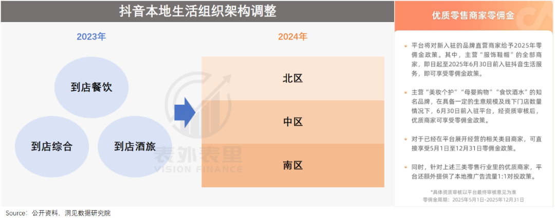 意识到这点的抖音,从 2024 年开始“ 变阵”。原本以品类划分的本地生活部门,按地域重整,尽可能吸纳台球、游泳馆等更多泛行业商家入驻;同时,对服饰、美妆、医美等能实现“ 内容即转化” 的品类 (线下团购),给予免佣金等扶持。