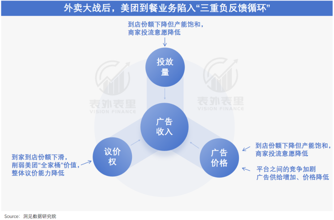 而广告价格走低,又会催动商家多平台经营,进一步影响美团到店产业链的“ 定价权叙事”。