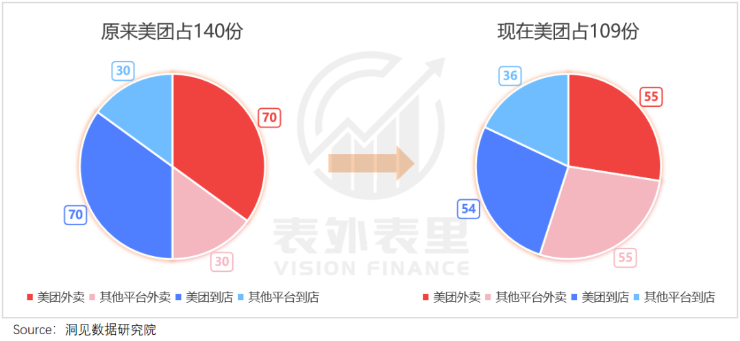 外卖大战后,外卖需求增加到 110 份,到店减少到 90 份,美团和抖音 GMV 份额占比为 6:4,可得前者占 54 份,后者占 36 份。