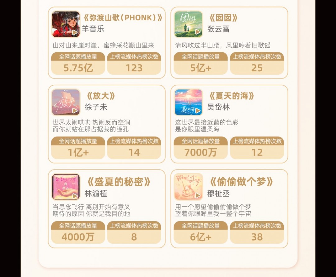 目前,快手平台音乐内容已全面覆盖三农、青春娱乐、泛知识等超 50 个垂类。与此同时,歌曲应用场景不再局限于短视频创作,更延伸至站内活动、媒体合作、跨界联动等多元领域,进一步释放了音乐内容的商业价值与文化价值。