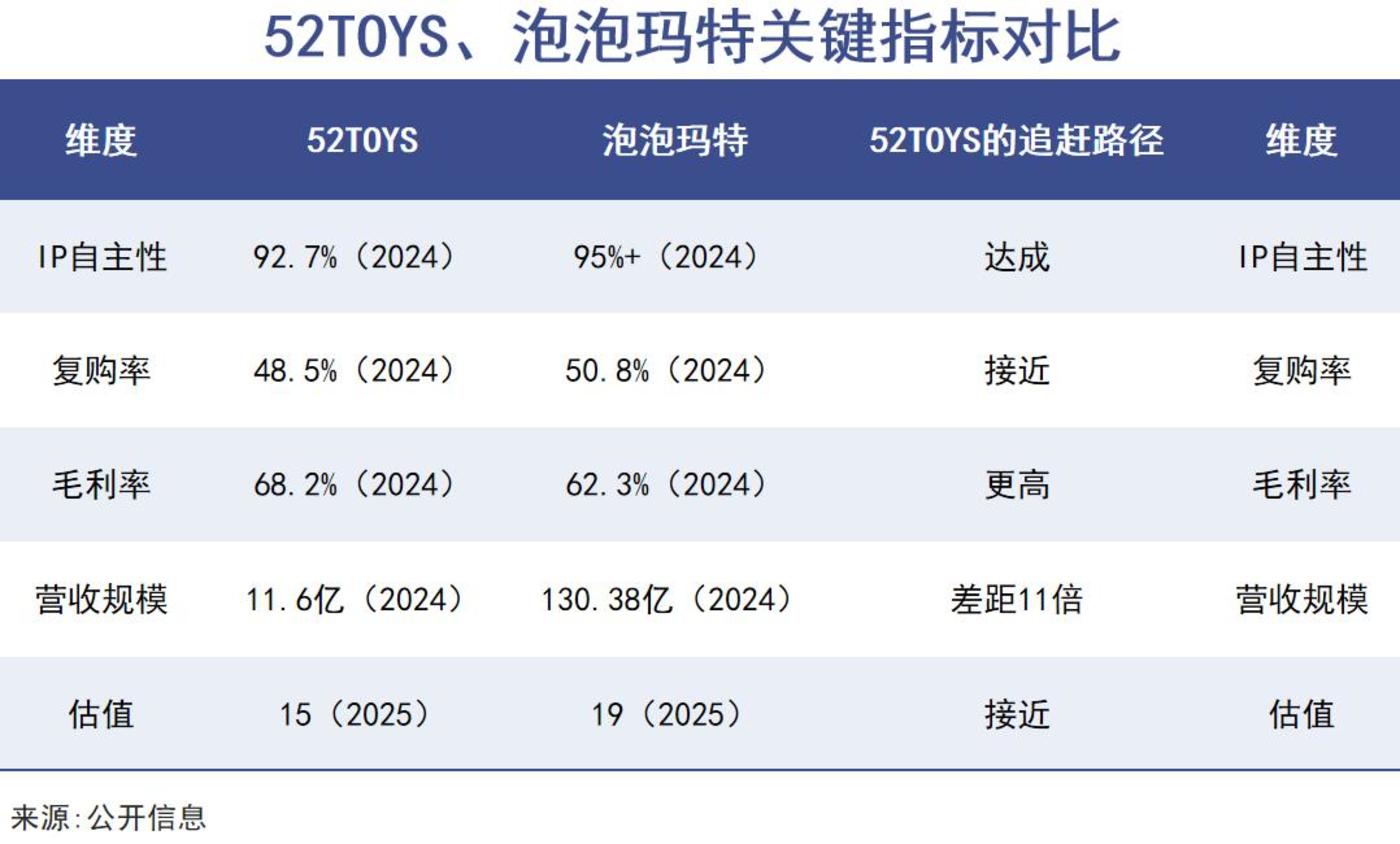 如果说卡游与泡泡玛特是形似神不似,那 52TOYS 可以说是形神兼具的同类。自主 IP、高毛利、强复购一样不少。中金的研究报告中曾经写道,「52TOYS 是唯一具备独立上市能力的国产潮玩 IP 公司,若 2026 年重启 IPO,估值有望达 25 亿元」。