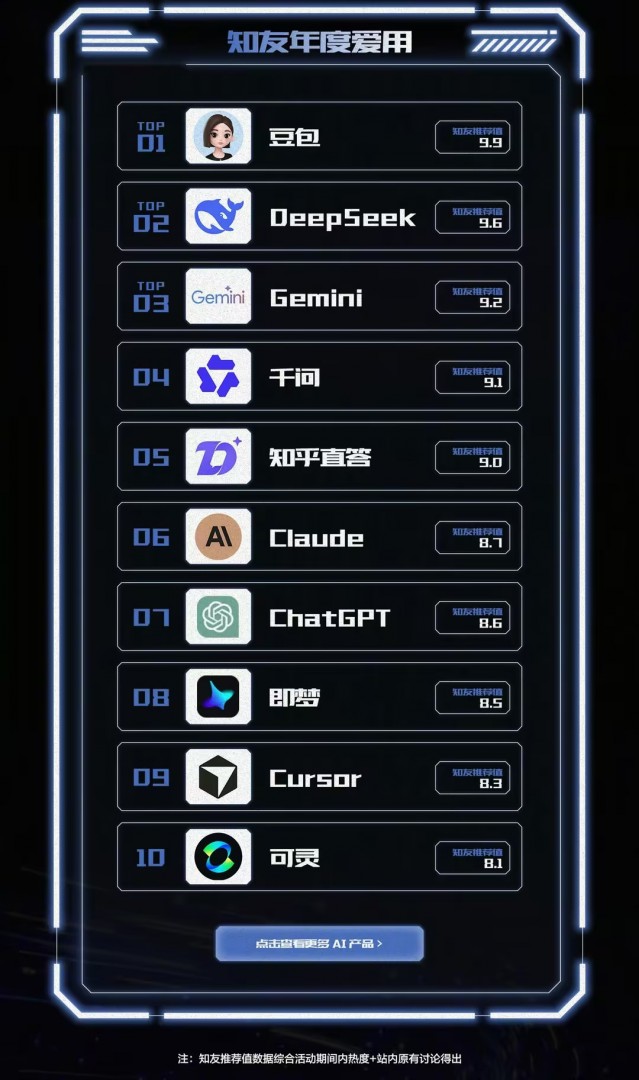 其中,豆包、DeepSeek、Gemini、千问、知乎直答、Claude、ChatGPT、即梦、Cursor、可灵,成为此次 「知友年度爱用」 产品榜前十。Gemini、ChatGPT、Claude 则跻身年度爱用的海外产品。