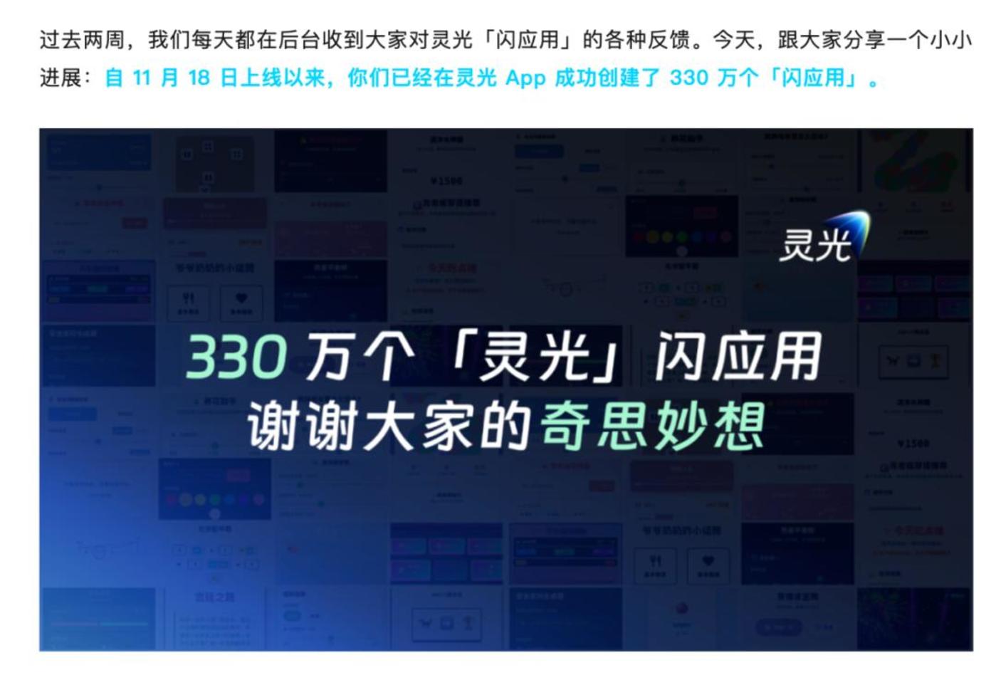 灵光宣布上线两周生成 「闪应用」330 万个,图/灵光 APP 官方微信公众号