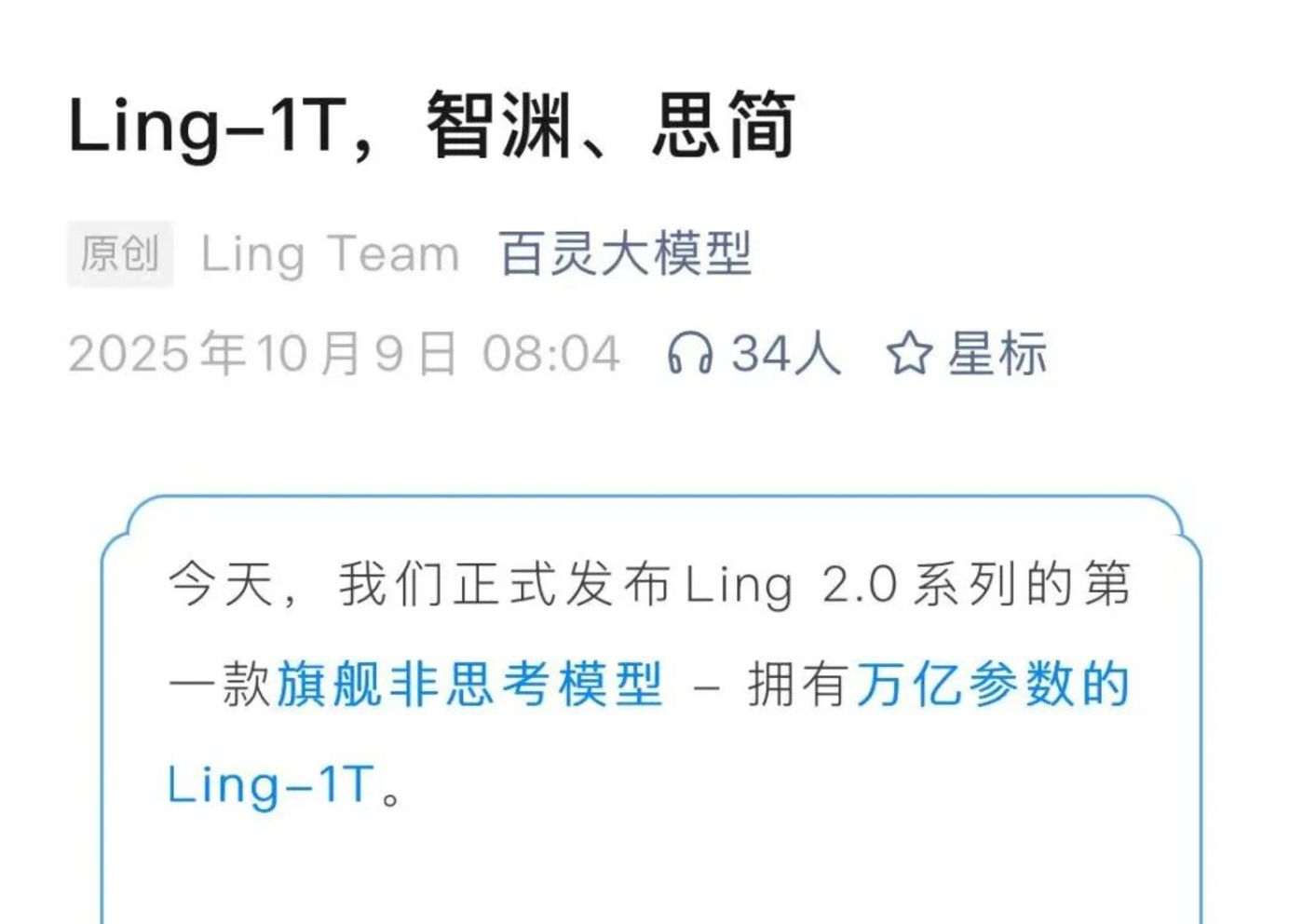 蚂蚁发布万亿大模型 Ling-1T,图/百灵大模型官方微信公众号