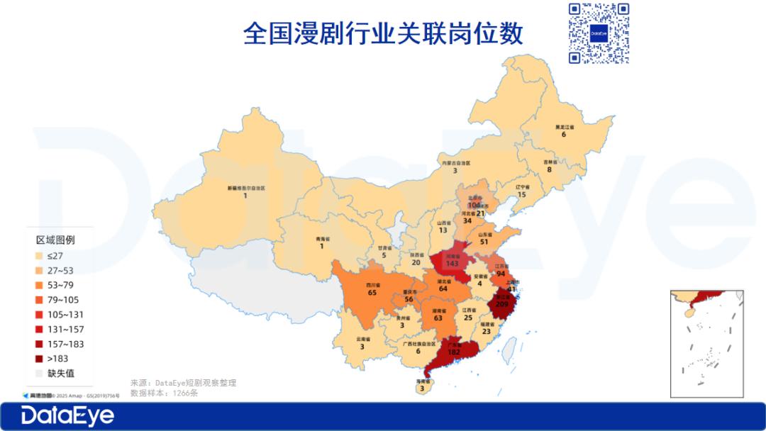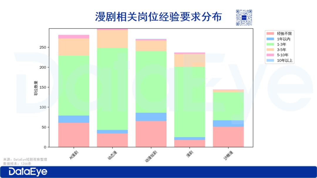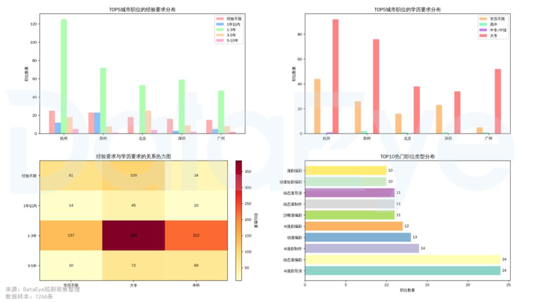 DataEye 短剧观察抓取了某招聘平台上的 1266 条全国漫剧相关的职位招聘记录,涵盖 5 个核心维度:城市、职位、地区、经验要求、学历要求,真实数据拆解漫剧赛道的产业格局、机会窗口与人才刚需!