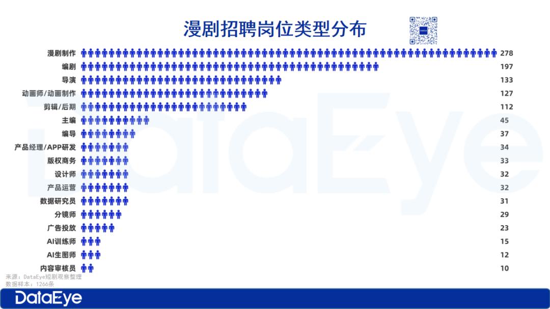 从抓取的 1266 条职位招聘数据来看,AI 漫剧和动态漫相关的职位占比均超 23%,是目前核心的漫剧业务类型。