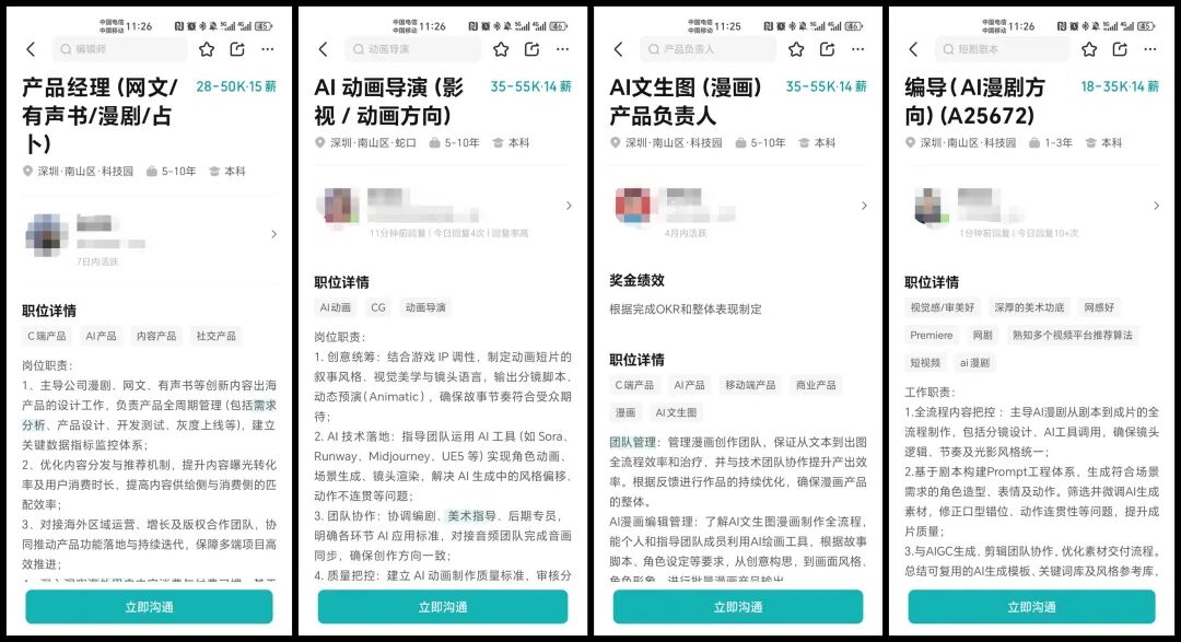 深圳依托强大的互联网技术生态,成为漫剧赛道的“ 技术创新策源地”。以漫剧 APP 研发、AI 工具训练为主的产品经理和 AI 训练师等岗位超 40 个,85% 以上集中在深圳,核心聚焦 AI 漫剧工具、分发平台的研发,技术型人才在这里拥有广阔发展空间。