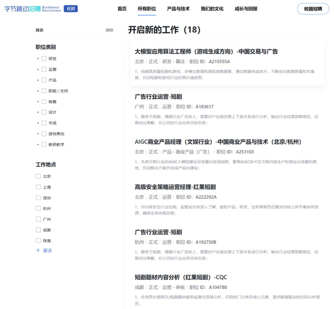 相较于短剧初期侧重内容制作岗位的招聘逻辑,漫剧赛道从起步阶段就高度关注 IP 的商业化与价值延长。除了将小说、游戏 IP 延伸至漫剧领域,上海、广州等地已出现二次元周边、IP 衍生物相关岗位招聘,标志着漫剧赛道正从 “ 内容本身” 向 “IP 商业化延伸” 横向扩张。