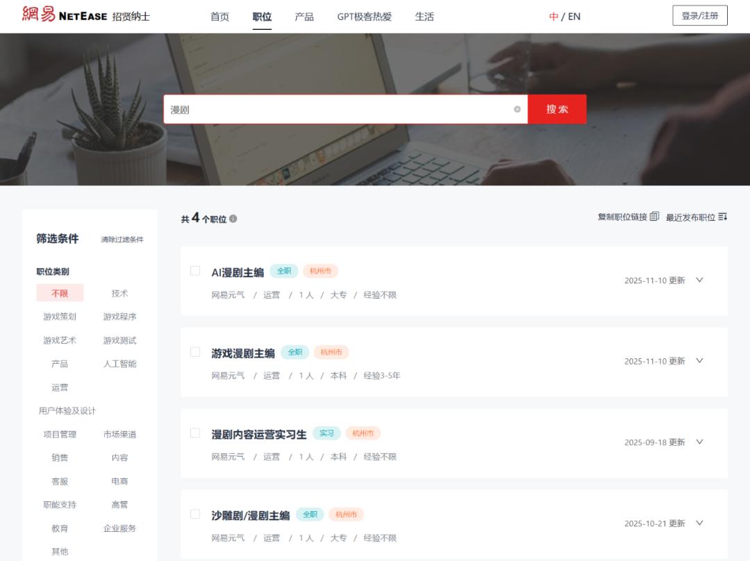 而网易主要招聘的岗位主要集中于内容创作方面,岗位包括 AI 漫剧主编、游戏漫剧主编、沙雕漫主编等。