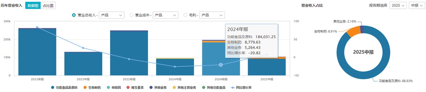 新诺威的转型迫切性,早已被持续萎靡的业绩数据拉满。作为国内咖啡因业务的龙头,其传统主业 (功能性原料含阿卡波糖、无水葡萄糖等,保健食品以 「果维康」 为代表)) 长期贡献 90% 以上营收,却在近年来陷入增长泥潭。