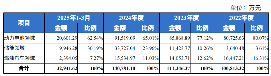 分业务来看,动力电池领域营收持续增长,显示行业地位持续稳固;储能电池领域营收则从 2022 年的 3640.48 万元爆发式增长至 2024 年的 3.37 亿元,三年内复合增长率高达 204%。