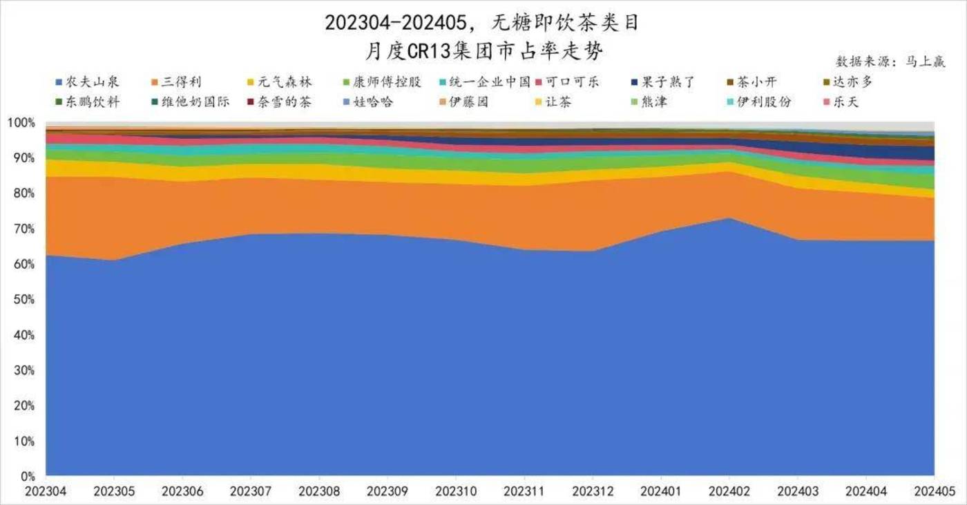 缺失的时间让康师傅的市场份额处于弱势。据马上赢数据,2024 年 4-5 月,农夫山泉和三得利的无糖即饮茶类目市场份额合计超过 75%,而农夫山泉所占份额就超过了 50%。