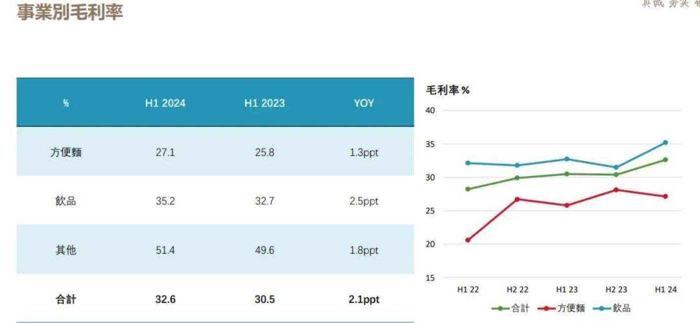 毛利率方面,康师傅表示期内透过产品组合优化与管理效能提升,使饮品毛利率同比提高 2.5 个百分点至 35.2%。