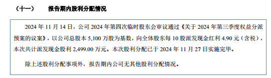 值得关注的是,在偿债能力弱于同行的背景下,隆源股份仍推进大额现金分红。2024 年 11 月,隆源股份召开 2024 年第四次临时股东会,并审议通过 《关于 2024 年第三季度权益分派预案的议案》,以公司总股本 5,100 万股为基数,向全体股东每 10 股派发现金红利 4.90 元 (含税),本次共计派发现金股利 2499 万元。
